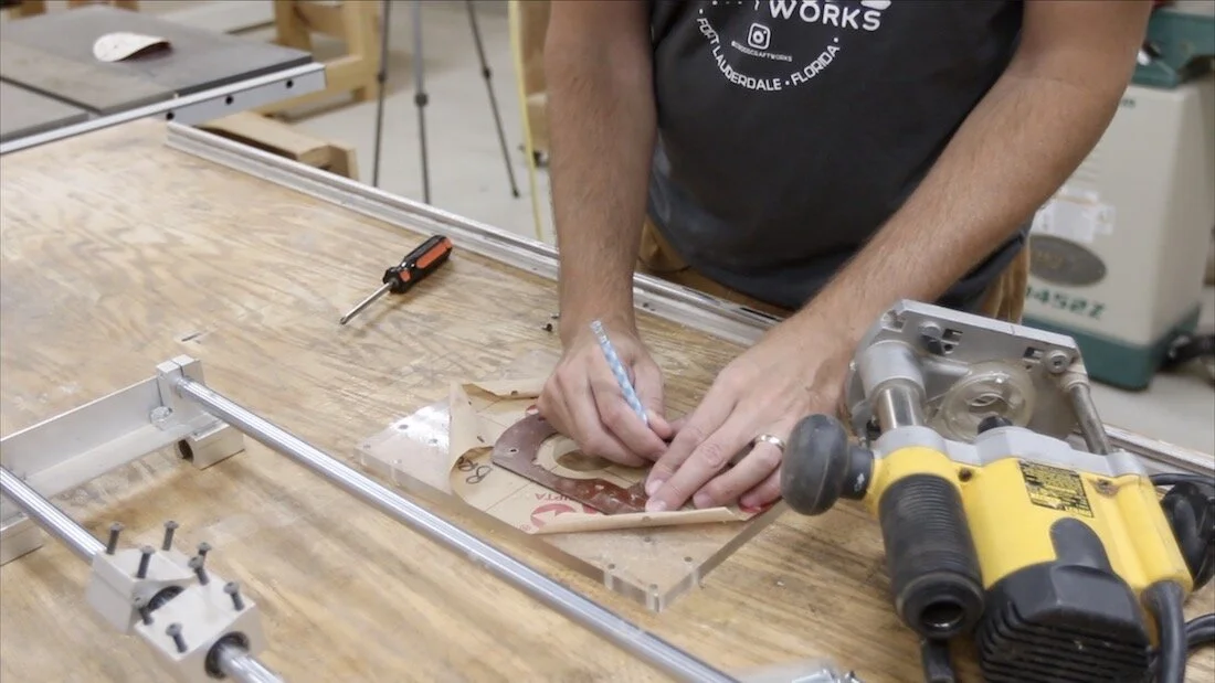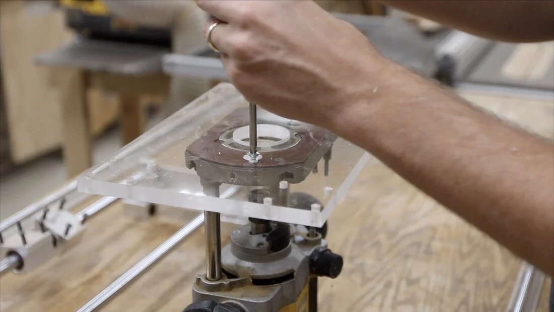 These router sleds have a thick piece of acrylic to attach the router, which helps you see what’s happening below. I like this feature. I just had to mark where my router would mount to it, countersink a couple of holes so the screws could sit below the surface, and get it all hooked back up to the mount.