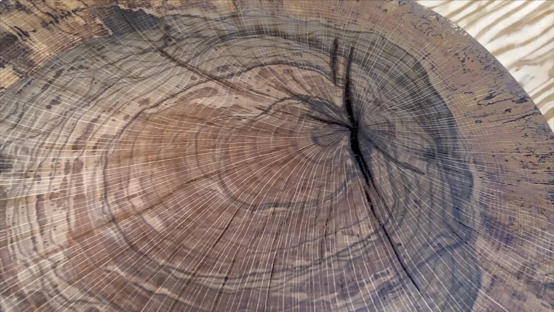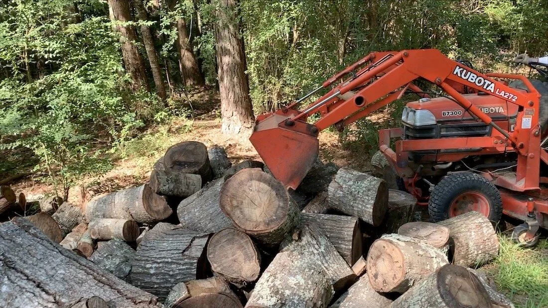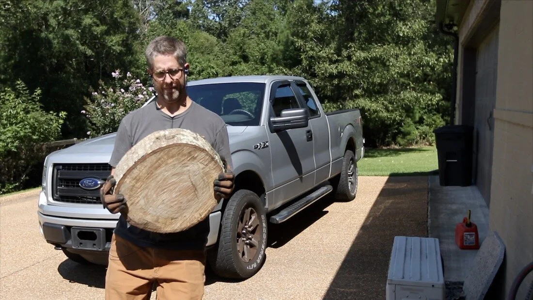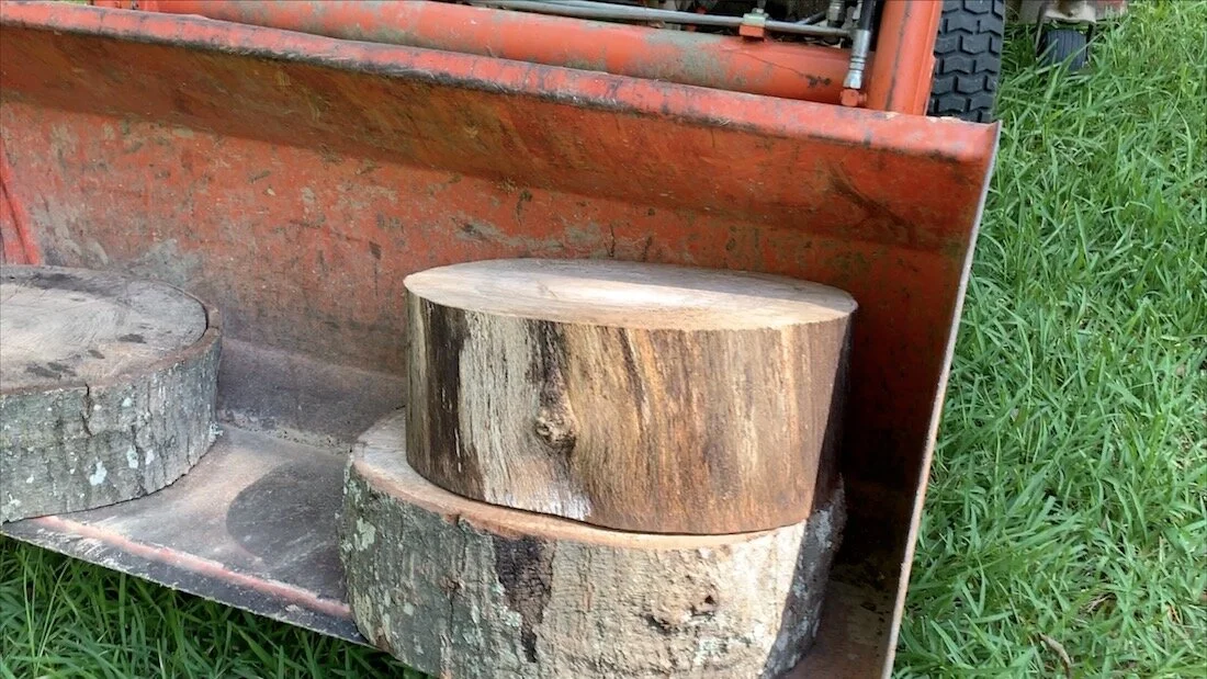 Next, I headed out to my parents’ property to dig through a pile of logs we had out there. This stuff was destined for the firewood pile (when it is not 100 degrees out, it’ll get split…this tree fell some months back). We grabbed the tractor and combed through quite a few before landing on the one I wanted to use. Then, I used my chainsaw to cut a couple of cookies (cross sections of logs) off. I didn’t know if I would need more than one, so I went ahead and cut three at the same time. This gave me a bit of insurance to make sure I could come through for the client if I messed up.