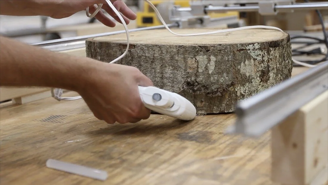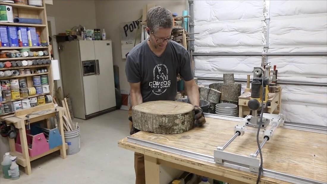 Once back at my house, I brought the cookies inside and chose the one I wanted to flatten first. I got it all settled on the workbench where I set up the flattening sled and used a bit of hot glue to hold down the stump and keep it from rocking or moving.
