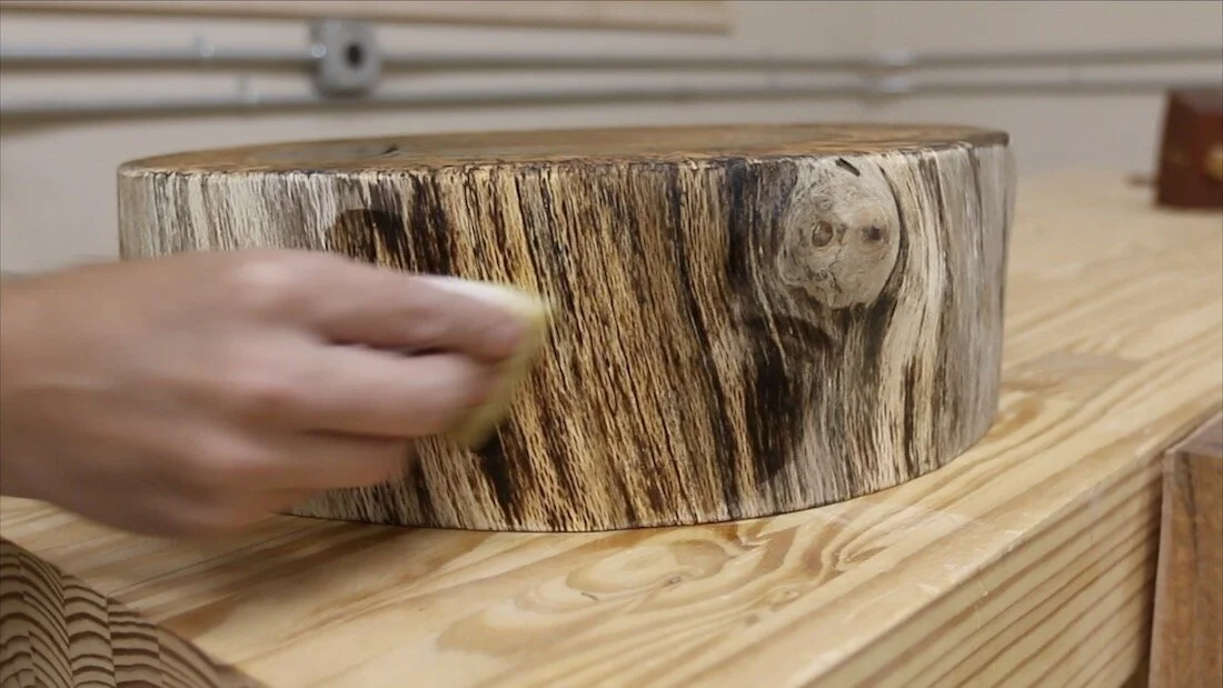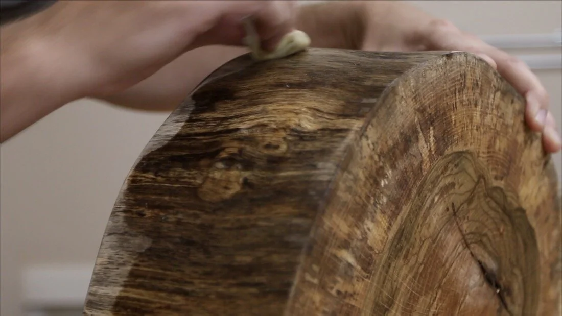 It was finally time to put some finish on this cool cake stand and see all of the grain come to life! For the finish, I’m using some walnut oil (big surprise). I just spread it around, let it soak in a bit and then wipe off any excess. This oil will actually dry and become part of the wood. Look at the black lines from the spalting!