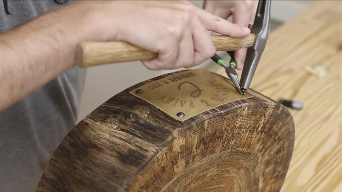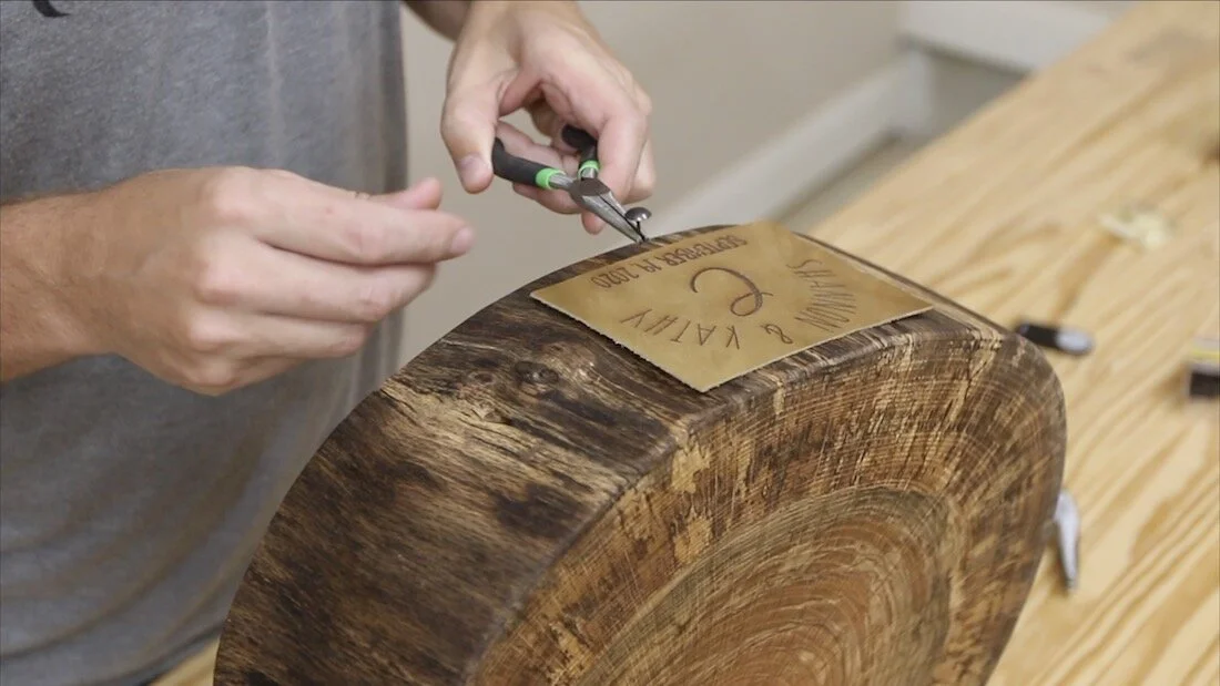Finally, it was time to add the laser engraved leather plaque. The client wanted their names, as well as a monogrammed letter of their last name and the date of their wedding, engraved into the face of the leather. I picked up some bronze upholstery tacks and used those to secure the leather to the stump.