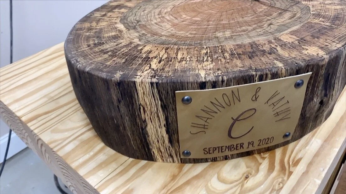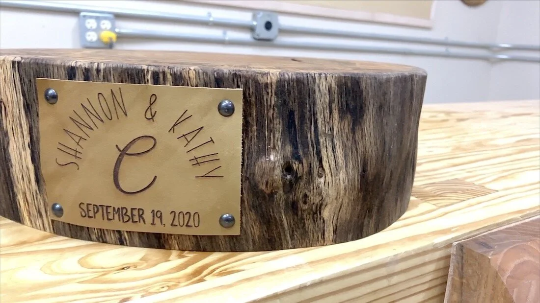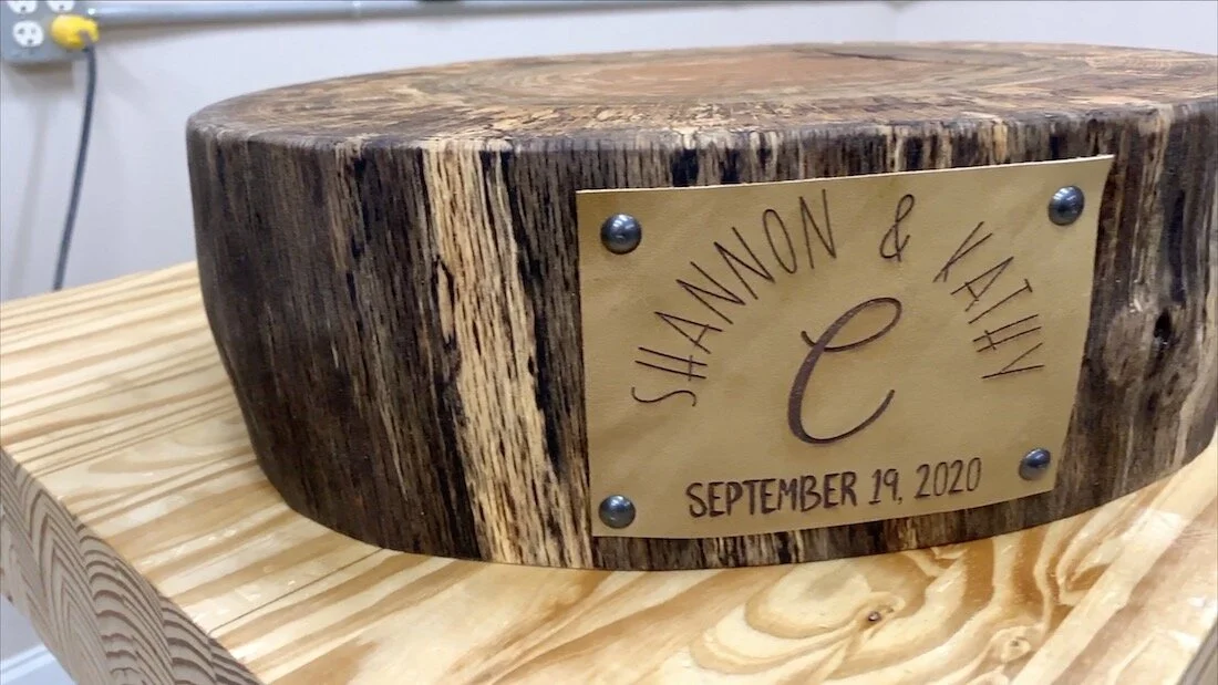 In talking with the client, they originally wanted the engraving of their names and the wedding date to be in the side of the stump. However, my Glowforge cannot fit this large of an item in the bed of it, so I had to come up with a different solution. My solution: leather. I knew that I could engrave a nice piece of leather and then maybe just tack it onto the side of the stump with some decorative tacks. I pitched this to the client and they loved the idea!
