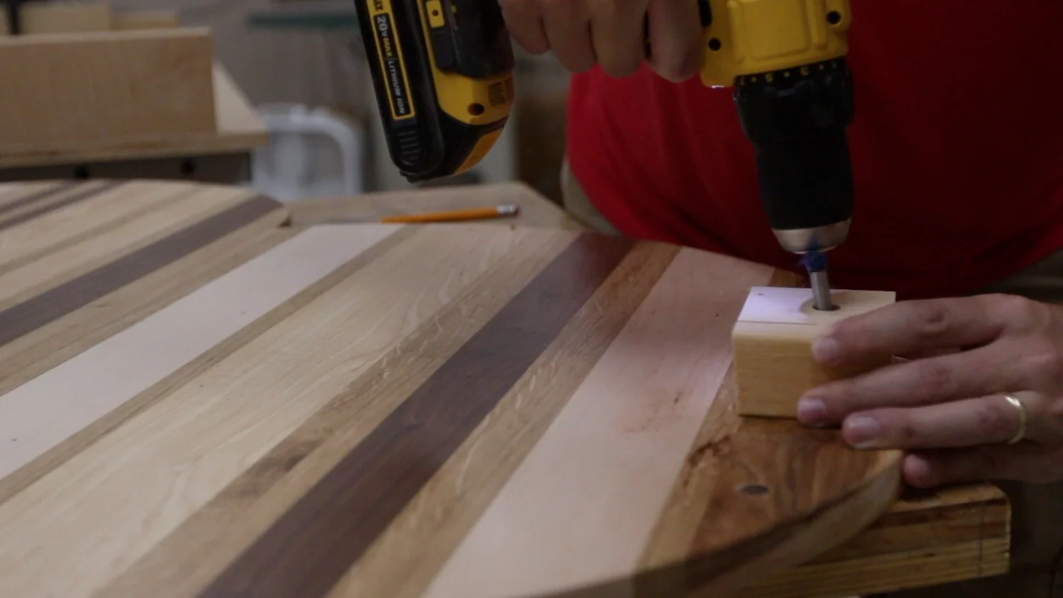 I put together this little jig to help me drill the holes for the pegs at a slight angle. They didn't have to be exact, but since I was using a handheld drill (too large to use on my drill press for many of the holes in the center), I needed something to help me repeat the angle. I drilled a starter hole in a scrap block at the desired angle, and then used that to guide my holes in the piece. This was a lot of drilling! I drilled 40 holes that were 1/2" wide, and at least that deep!