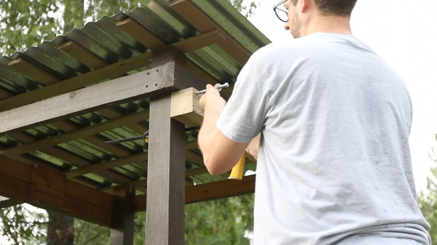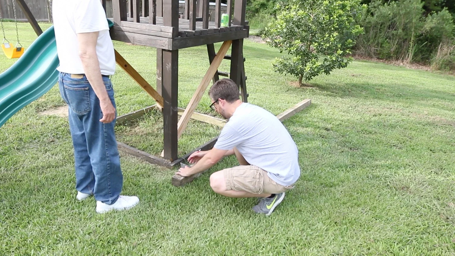 I started off by assessing where the 4x4 needed to be installed so that the rope swing would work optimally. My dad was on site to help me with the install. We found the spot where we thought the 4x4 should go, and started off by marking out how long we needed the 4x4 to be.