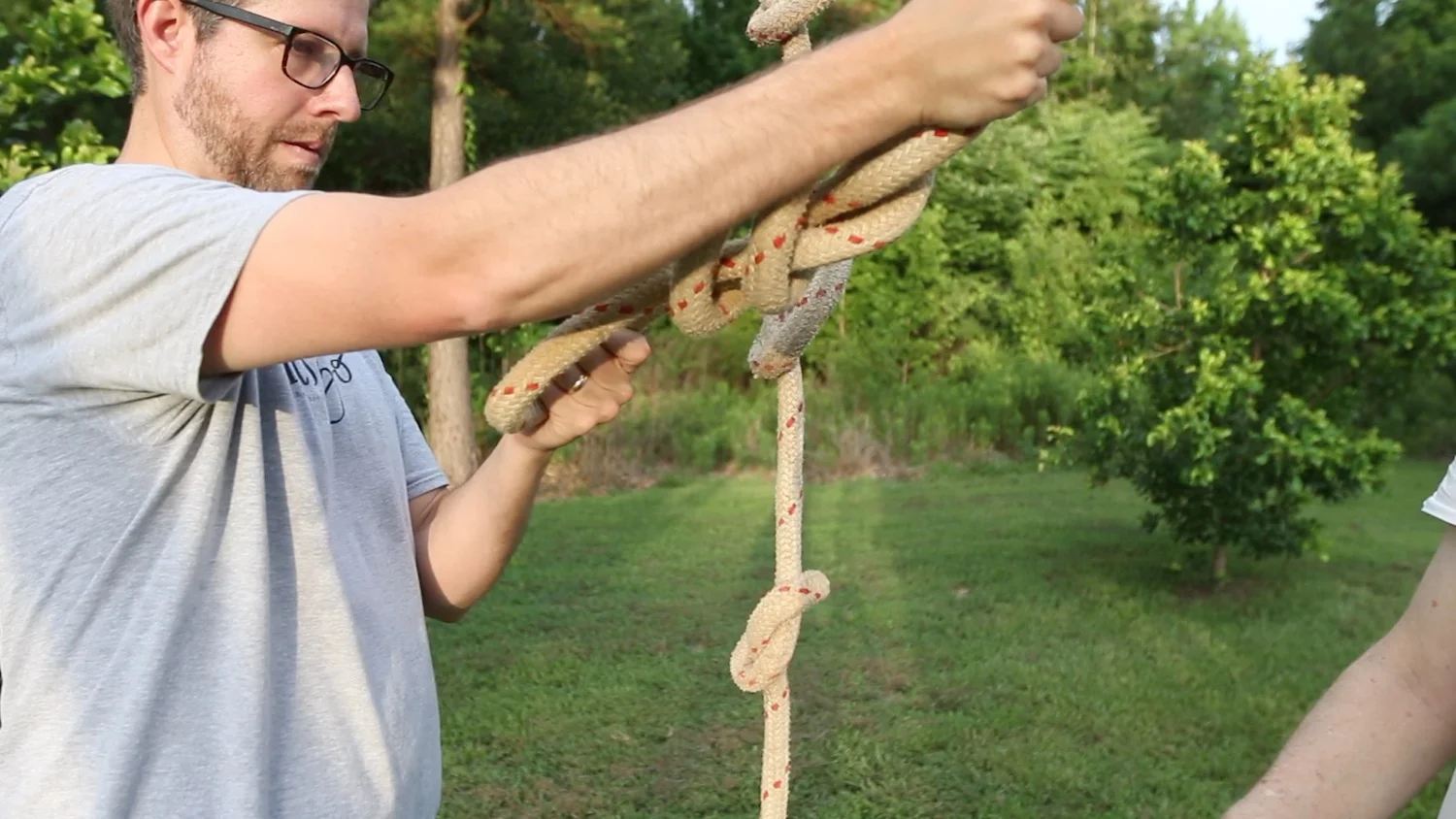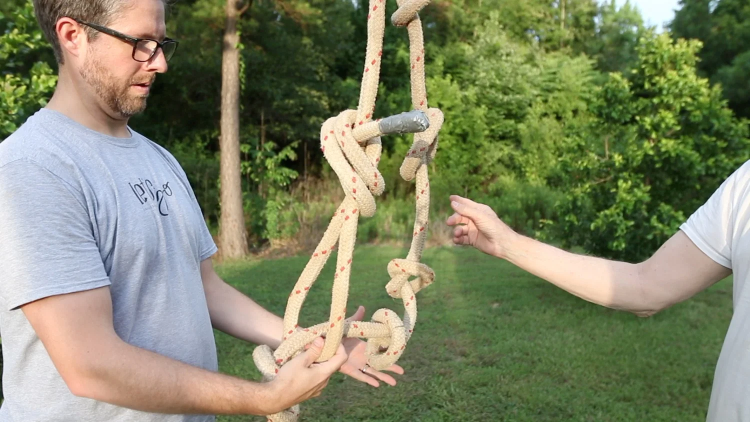 Once the rope was secured to the support, we started tying some knots that could be used to hold onto or swing. We originally thought a knot every 12" would be good, but that seemed too close, so we ended up tying one about every 18".