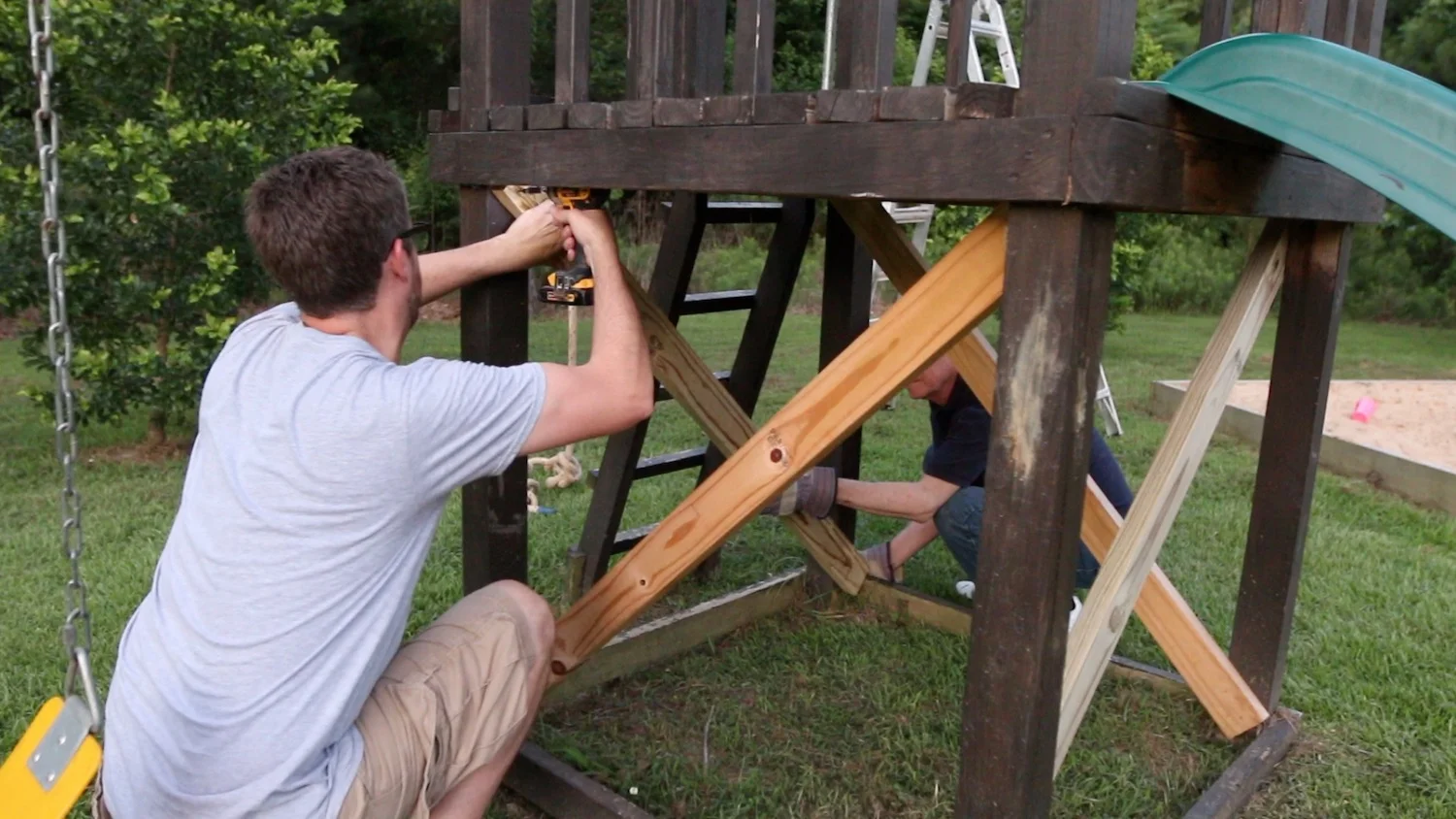 We added some diagonal supports under the playhouse since this new rope swing would introduce pull in a different direction than the regular swings. They worked quite well, and the whole thing is very steady.