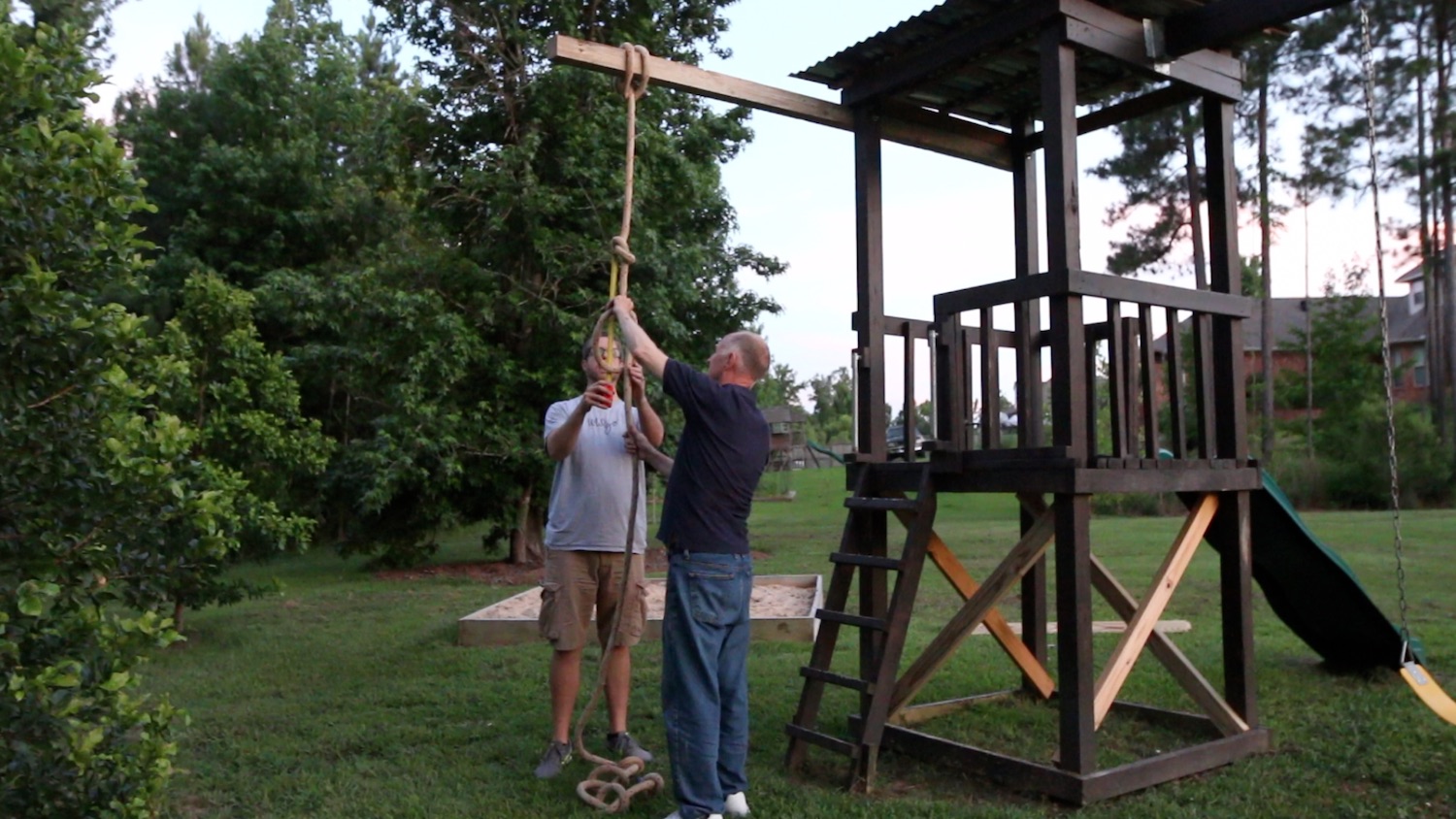 My dad has a bunch of this huge, marine rope that he ended up with...hundreds and hundreds of feet of it...so he is always looking for something to use it on. This was the perfect project to use that rope, and it just seemed like the right time. Oh, and he had a 4x4 that was in his barn that we could use to secure it!