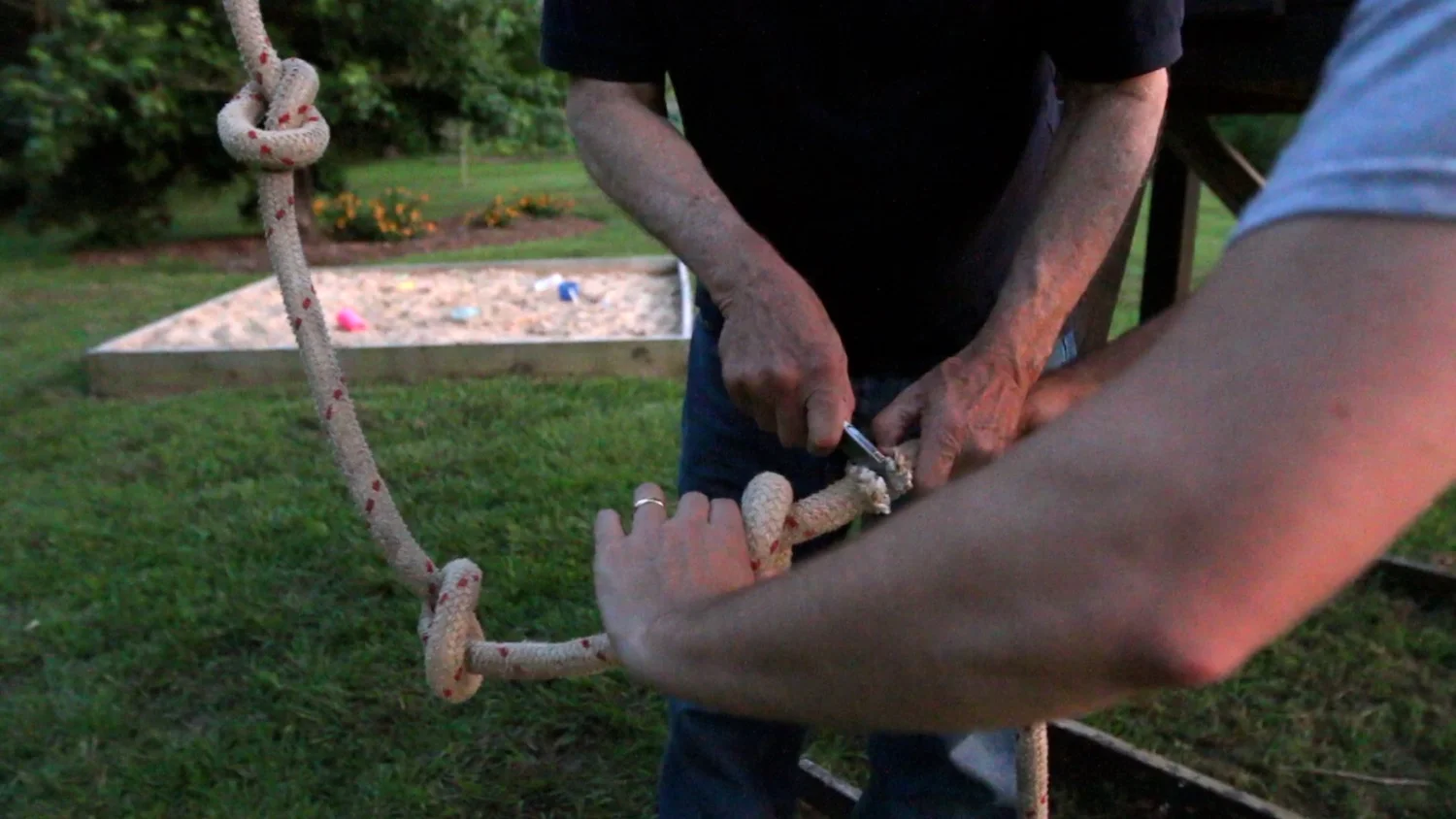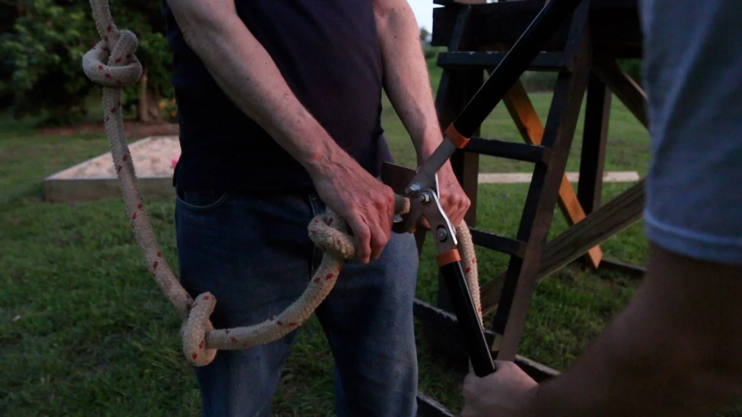 We brought a little too much rope from the stash my dad had (better than not enough), so we had to cut a little bit off of the end so it would not drag the ground. We actually just used some lopping shears for this, and it worked surprisingly well. The last bit that the shears would not cut through, we just used a knife.