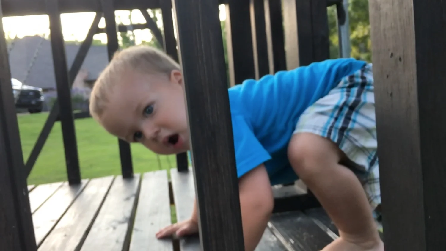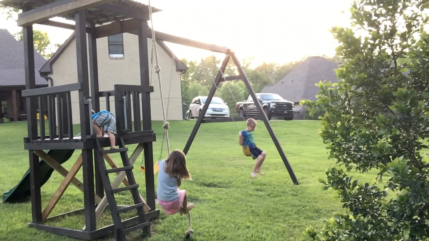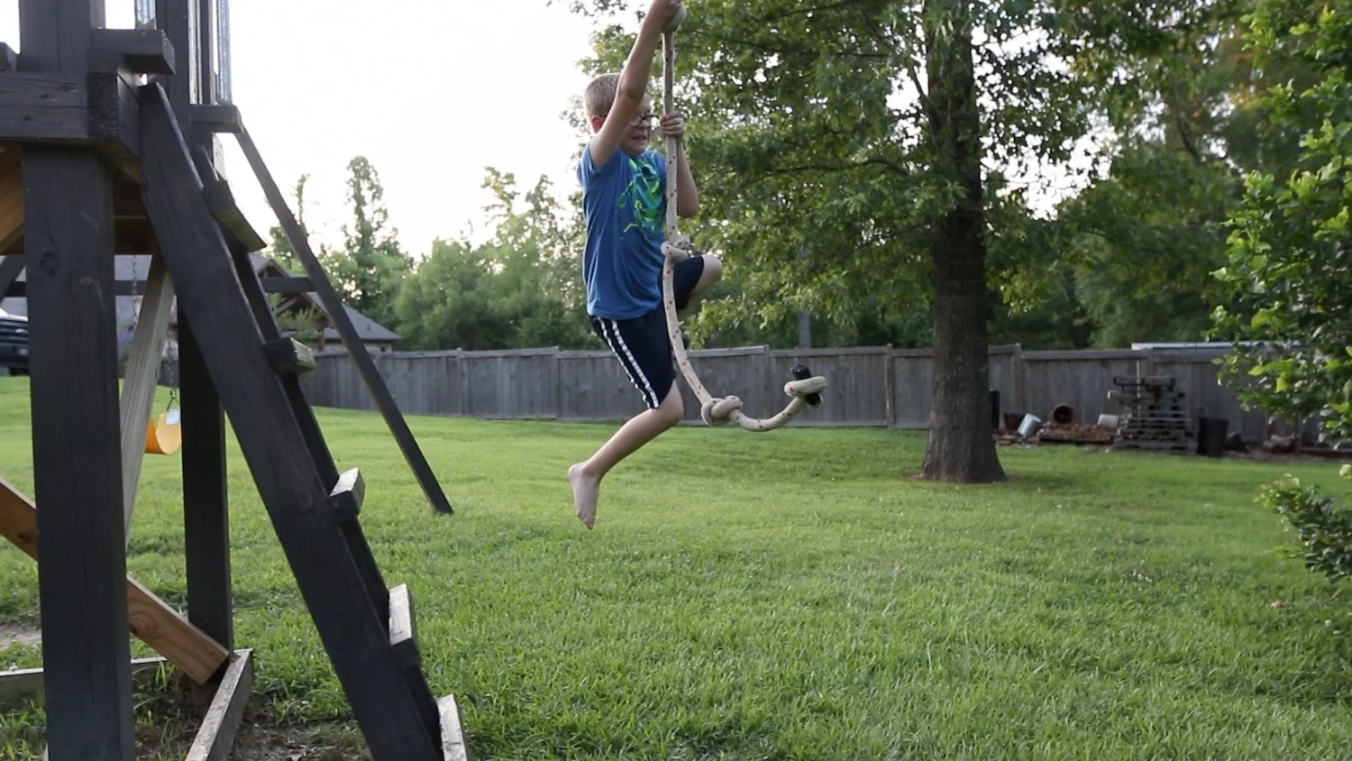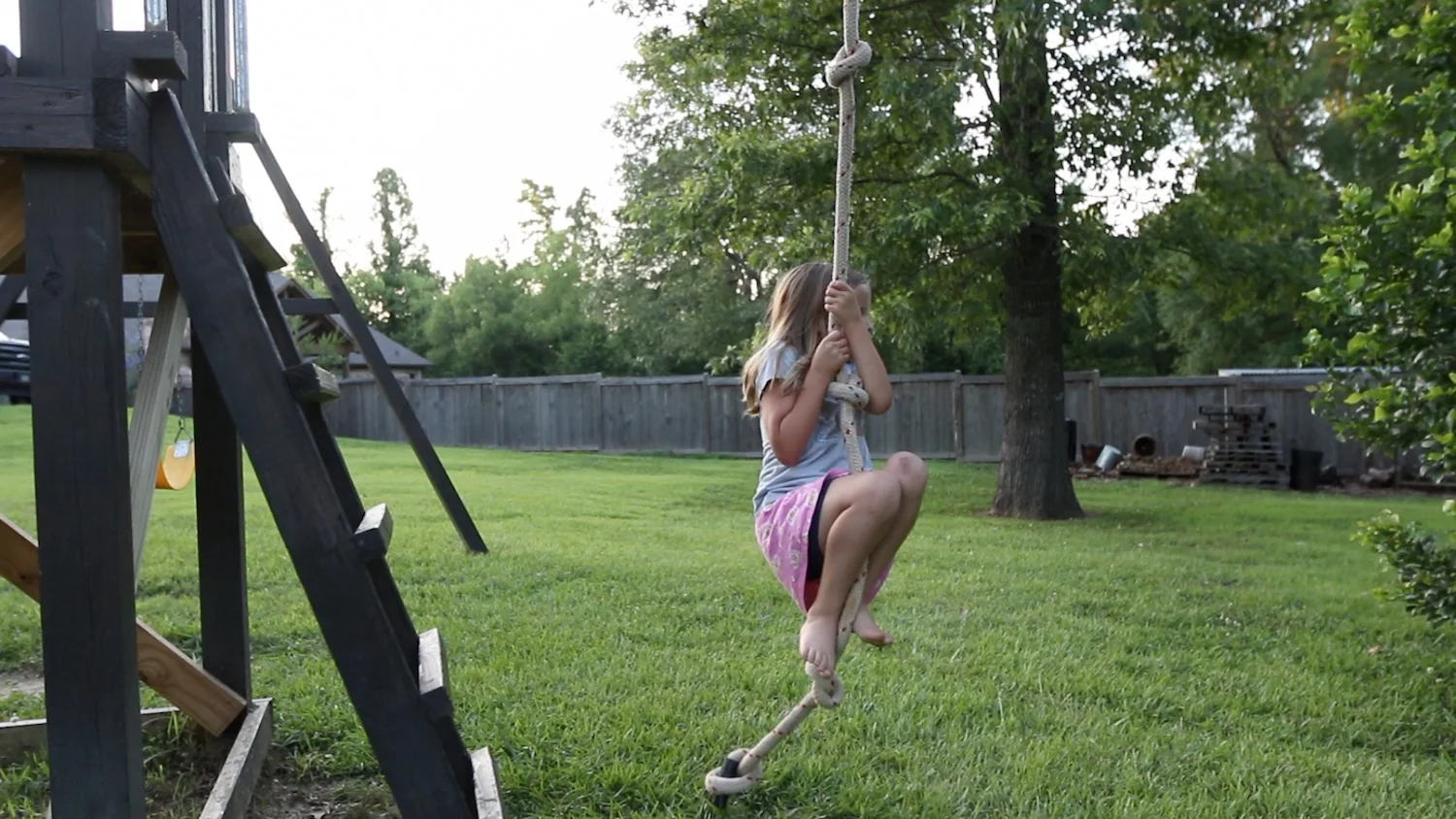 A rope swing and climbing area on their playhouse in the backyard.