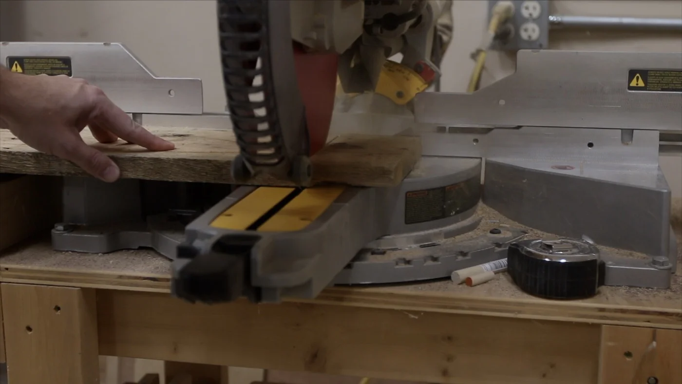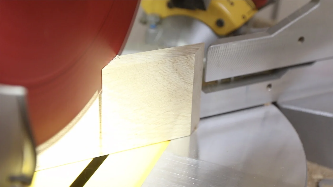 From there, I took it back to the miter saw and started cutting a few of the pieces that would make up the jaw of the stitching pony at a 45 degree angle. For the longer, outside jaw pieces, I just needed one 45 degree angle to be cut. For the inner jaw pieces, I had to cut both sides at a 45 degree angle, but they were parallel from one end to the other. (It'll make more sense when you see the photos)