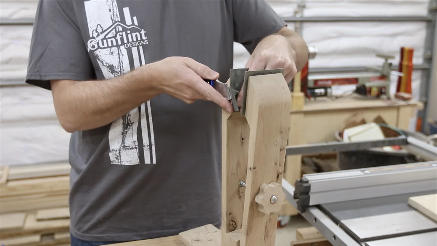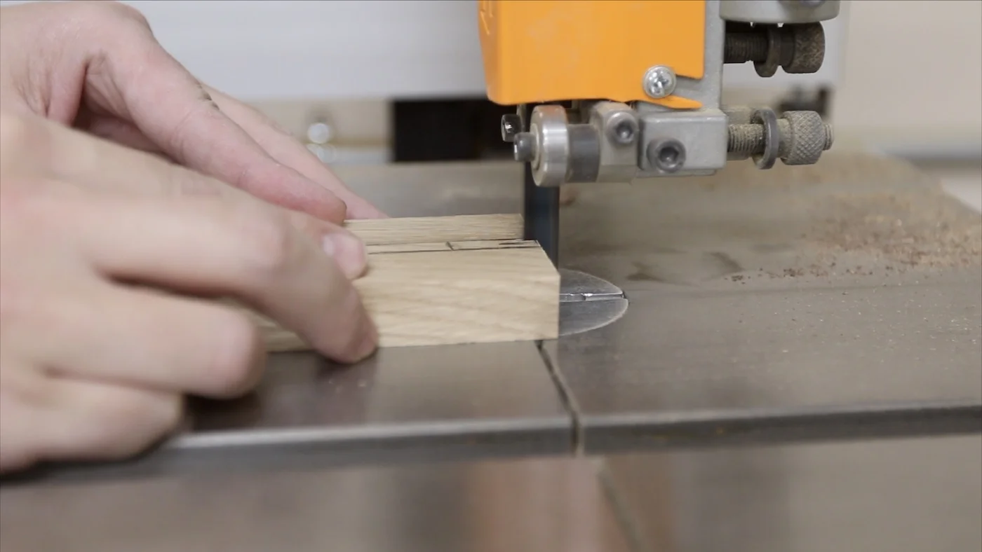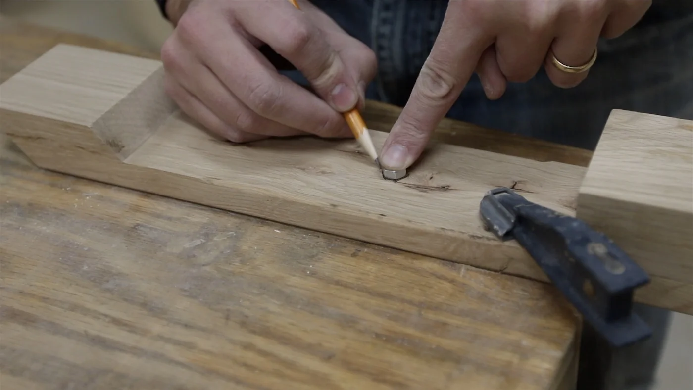 I started out by marking how large the bolt was on a scrap piece of the same white oak. Then, I took it to the bandsaw to cut out that notch. I made it go over halfway through the piece, so it would sit down onto the bolt far enough and have plenty of room for the knob to tighten against it.