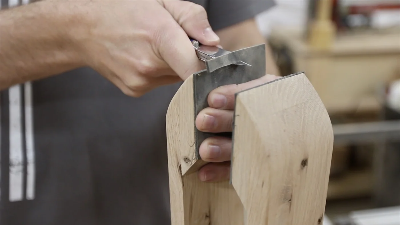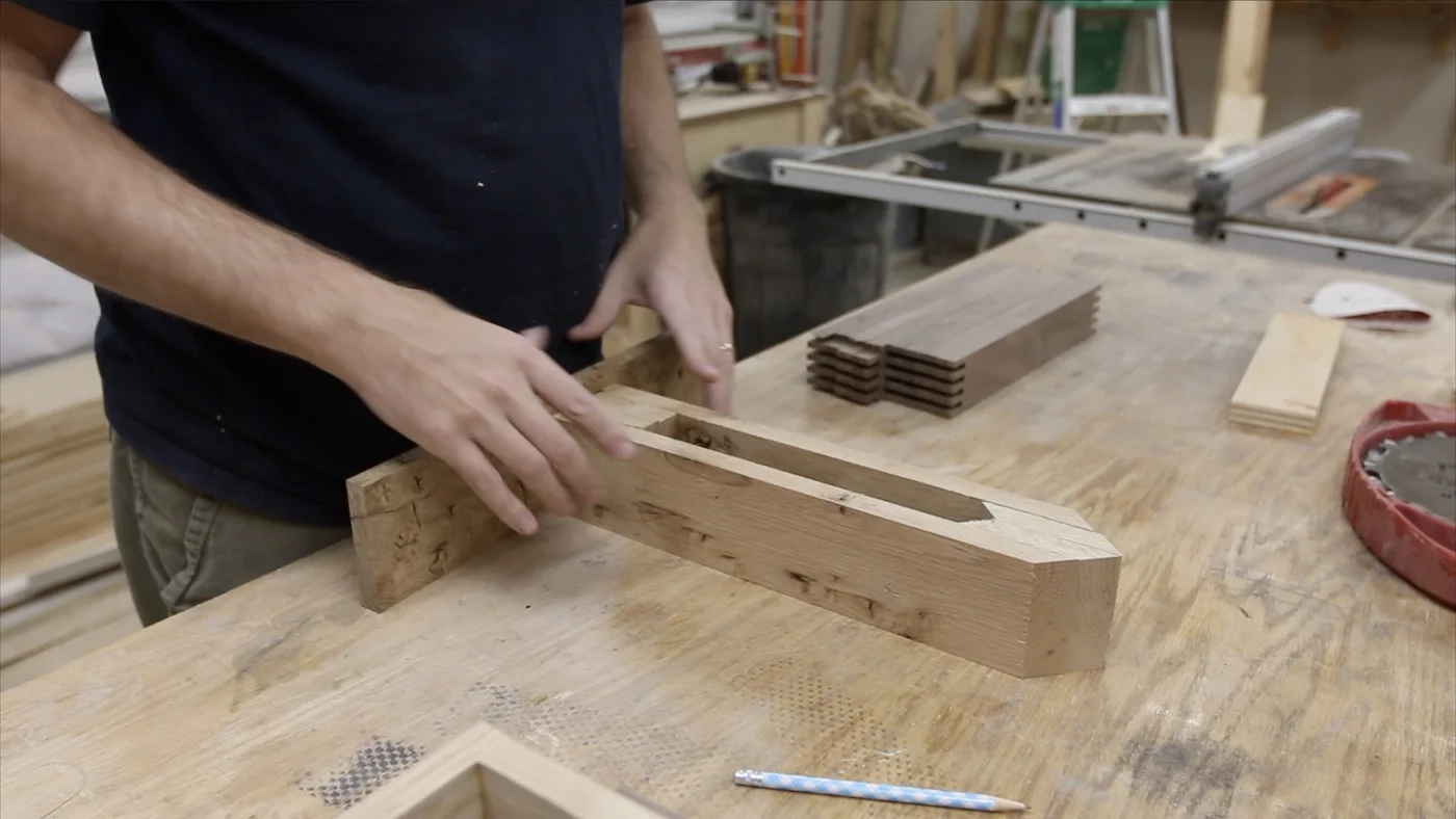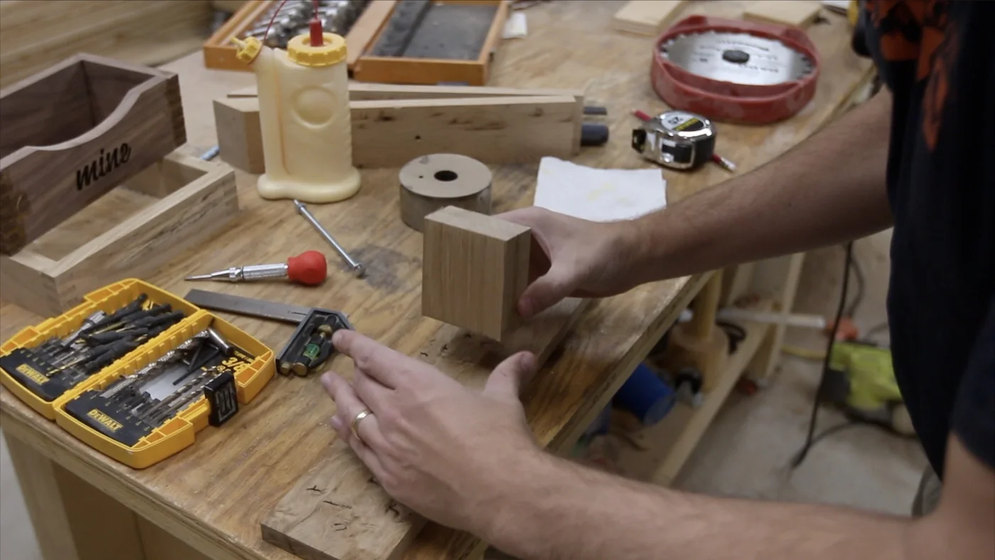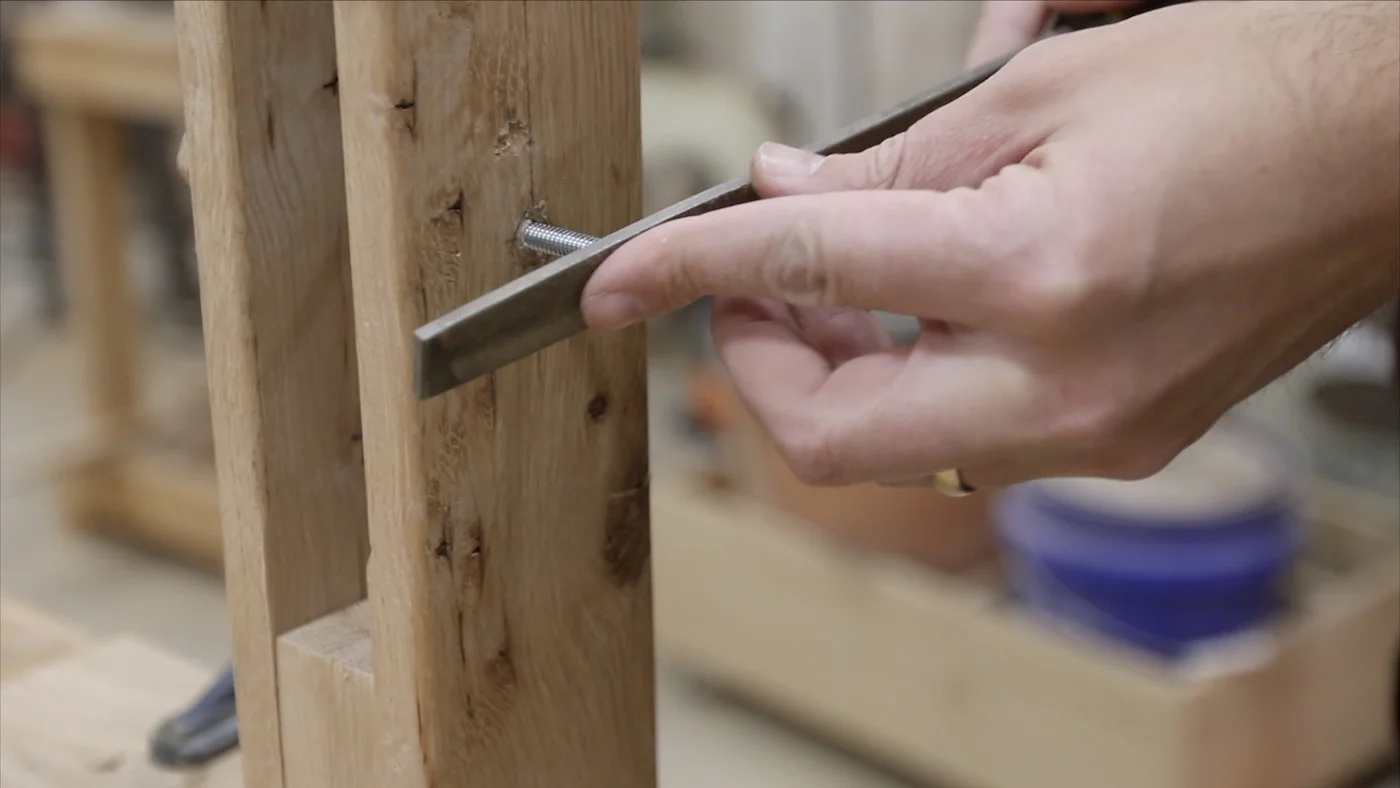 I started out by marking how large the bolt was on a scrap piece of the same white oak. Then, I took it to the bandsaw to cut out that notch. I made it go over halfway through the piece, so it would sit down onto the bolt far enough and have plenty of room for the knob to tighten against it.
