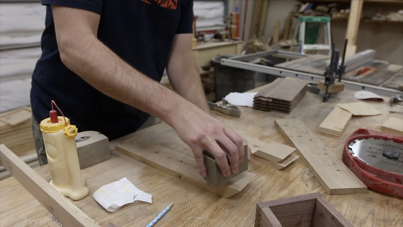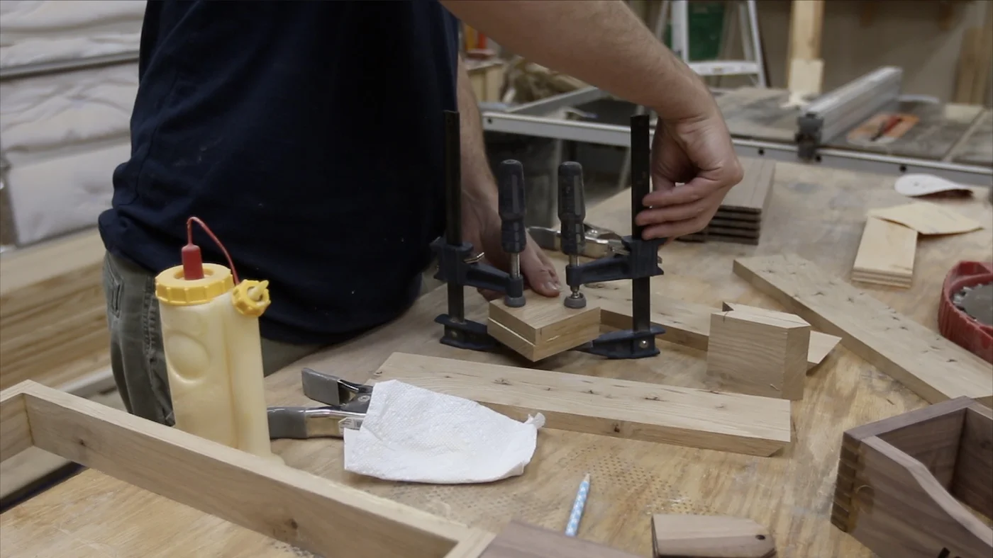 Then, I just had to start gluing the jaws together. The longer pieces would get the smaller, inside pieces glued to them, and I just used some heavy steel blocks as clamps.