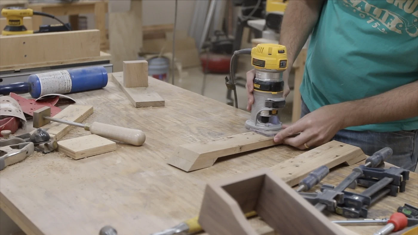 Before adding the other side of the jaws, it is a good idea to do some initial sanding and rounding over the edges a bit. You don't want any sharp parts or corners poking you as you're working with this stitching pony. I used a 1/8" roundover bit in my router to ease some of the corners.