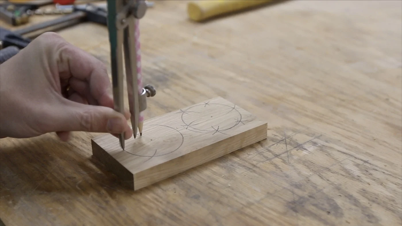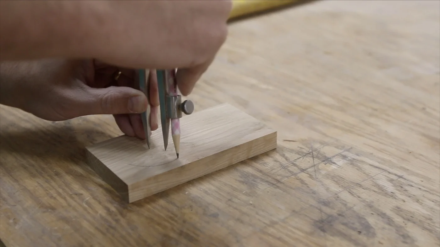 I drew a circle on another piece of white oak with my compass. Then, I used the radius (1/2 the diameter), and starting on a part of that circle I just drew, I marked where it intersected the previously drawn circle in both places. Then, I placed the point of the compass on one of those new intersections, and did the same thing...drawing another two intersections. I did this until the circle was evenly sectioned out.