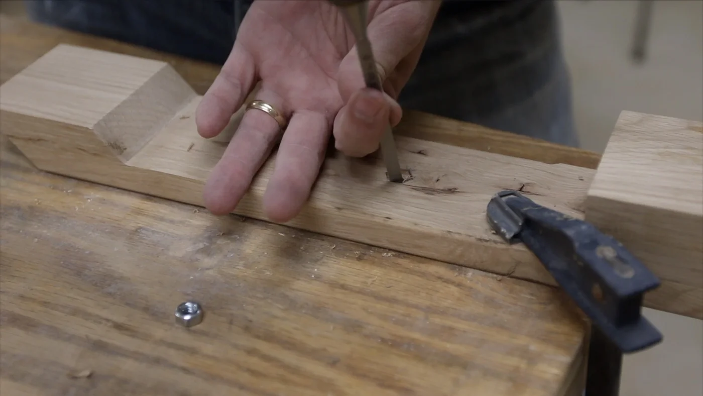 I started by marking out where the nut was with a pencil. Then, I started chiseling away until I could get it deep enough. I’m not that good with this type of chisel work, but I want to get better, so I had to practice on this. It helps to remember that you can just take your time and work on it gradually until you’ve cut out all that you need to.