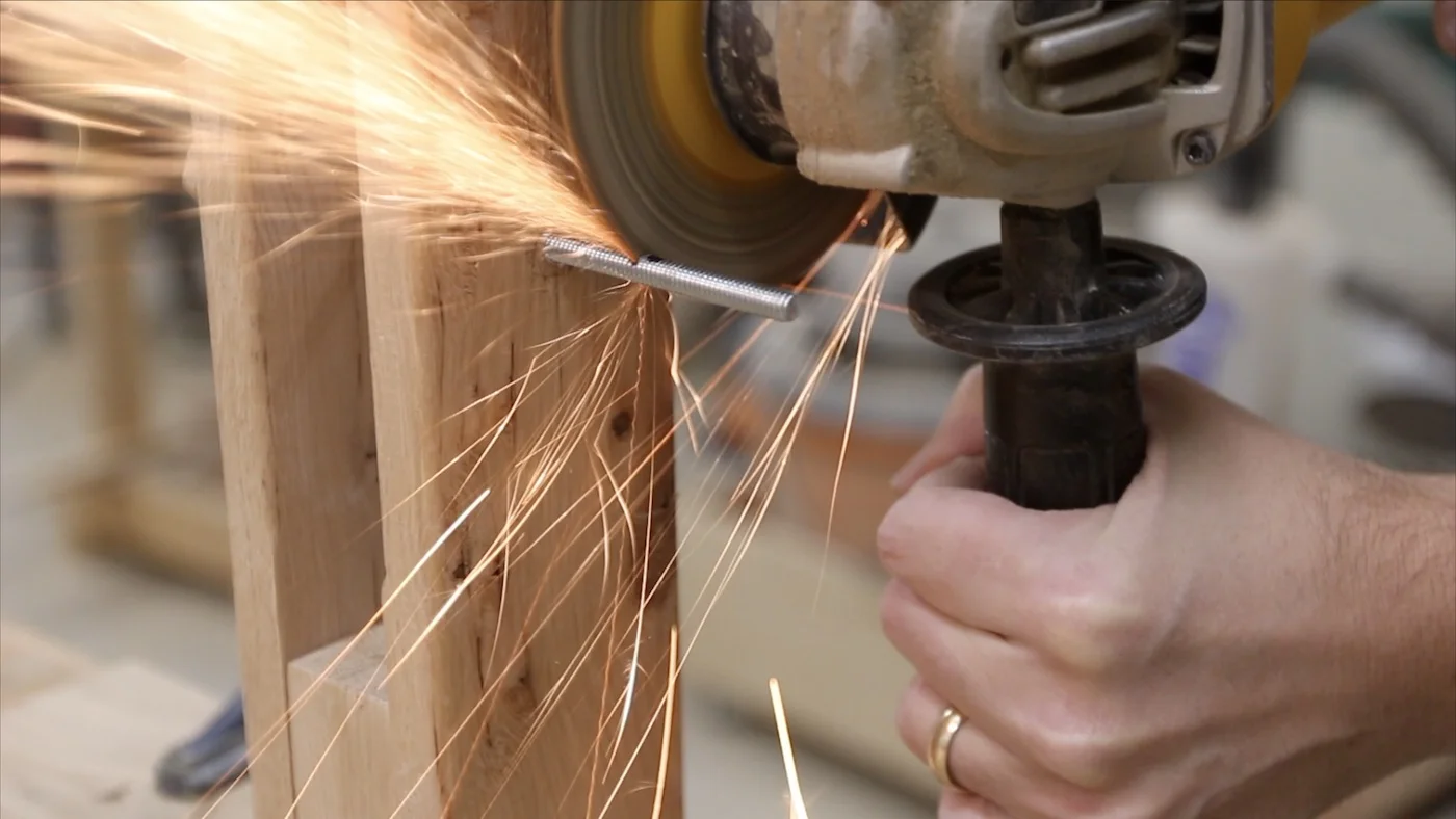 Then, I put a cutoff wheel on my angle grinder and cut off the bolt where I marked the line. This left a little bit of a burr on the end of the bolt, so I just used a file to get rid of that burr and smooth it out.