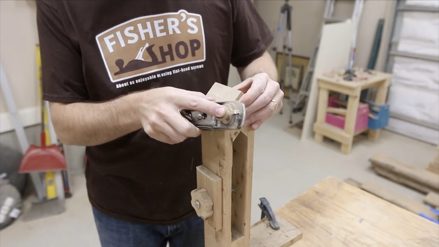 The fixed jaw can just be glued at this point to the base and to the spacer block that has already been glued to the base. Just be sure to keep it flush to the sides of the spacer block…it should be the same width since all of the pieces were ripped at the same time.